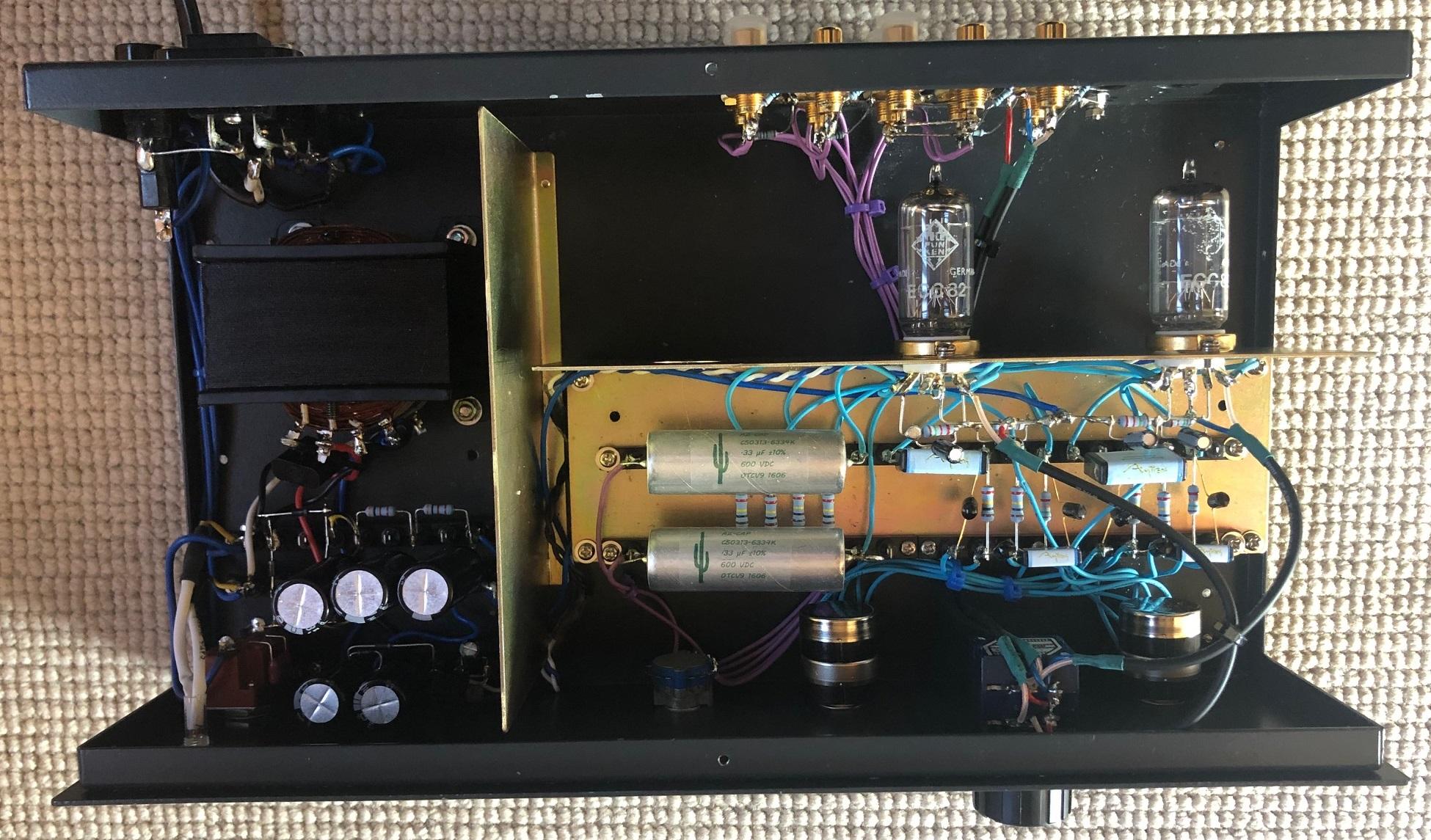 パーツはできるだけ高品質に。金属被膜抵抗とフイルムコンデンサーはアムトランス製、カップリングコンデンサーはArizona Capacitorsオイルコンデンサ「グリーンカクタス」、真空管はテクソルで購入したテレフンケンECCE83、増幅部VRはアルプスRK27 、トーンコントロール部VRは東京コスモス電機炭素系可変抵抗器 RV24YG型 、電源トランスは春日無線変圧器製 、セレクターはTAC6付属を再利用。