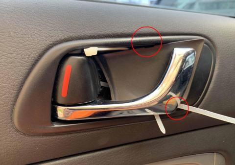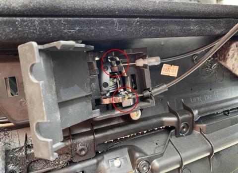 赤い四角の部分にドアオープナーのケーブルが入っていますので開けて外します