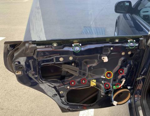 ネジを抜くとガラスと共にモーターが落ちてくるので、落ちた状態で赤○の部分2カ所のネジを外して、ガラス部分とモーター部分を分離して、大きい窓からモーターだけ取り外しますが、出しにくいので分離したら、ガラスを上にもう一度上げて、1つ前の写真の緑の○のガラスを押さえるネジを締めて落ちない様にしておきます(一人でやる場合)