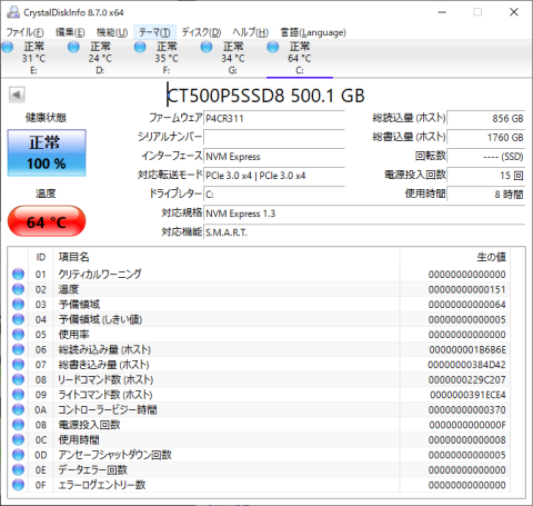 CrystalDiskMark実行中におけるSSDの温度は、最高で64℃となりました。