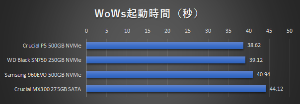 結果はというと…38.62秒でCrucial P5がトップに、続いてWD Black SN750、Samsung 960EVO、Crucial MX300という結果となりました。