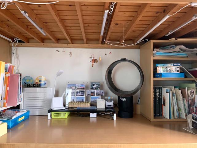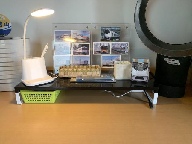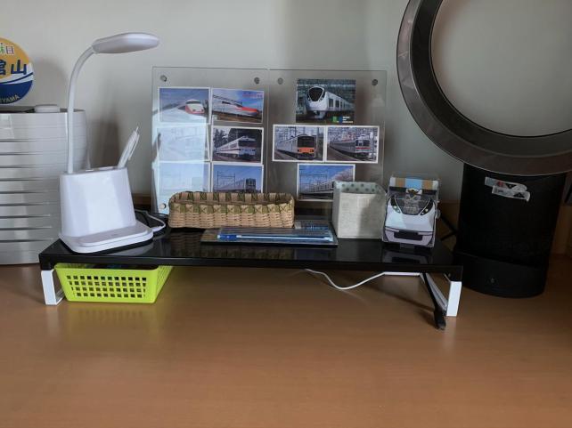 ロフトベッドなので、卓上にはベッドがある状態で下記の写真の感じになっています。ベッドが屋根になっている分、暗いのは仕方ないです。
