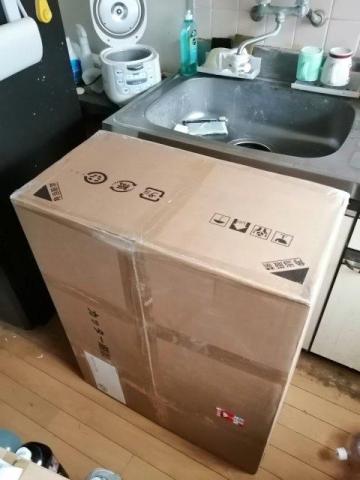 台所で箱を開封し、