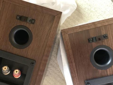 一見すると背面にはバスレフポートと端子板があるだけで、壁掛けできるようには見えませんが、よく見るとバスレフポートの上に2箇所小さな穴が打ってあり、そこをネジ穴として切れば金具が取り付けられるということです。