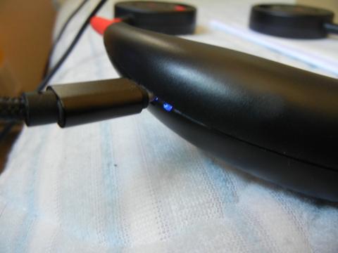 充電時にはmicroUSBコネクタ横に赤いLEDが点灯し、充電が完了すると青色に点灯します。