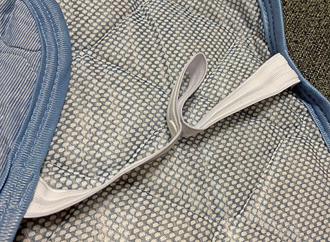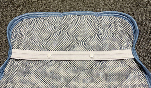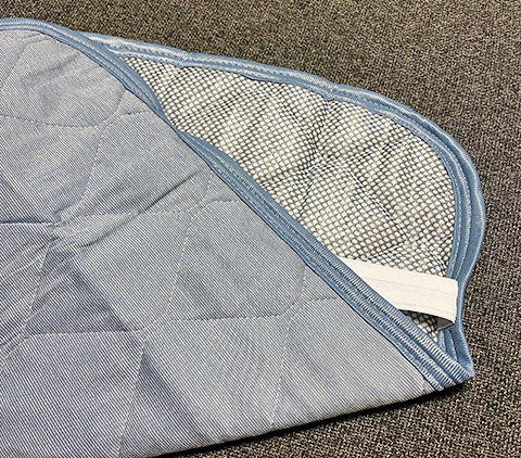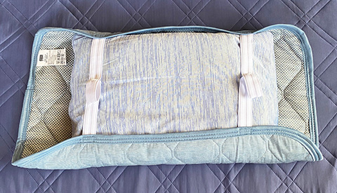 本製品は枕をスッポリと入れてしまうカバーではなく、枕の上に乗せるパッドという扱いです。外れ防止のゴムバンドを枕に掛けて使用します。枕のサイズに合わせてゴムバンドの調節も可能となっていて、基本的には43cm×63cmあるいは50cm×70cmの枕に対応していると記載されていますが、私の使っている小さな枕(35cm×50cm)にも使用可能でした。