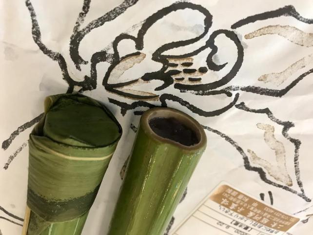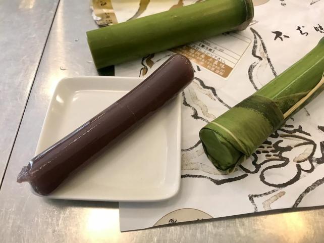 ほんもんの竹筒に 水ようかんを流し込んだ後 笹の葉で封をしたはります