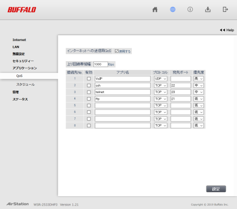 QoSの設定画面。玄人でないと無理そう・・・。なお上位バージョンのアドバンスQoSなら機能のついている説明書を見る限り、ゲームとかブラウジングとか簡単に設定できつつ、詳細を煮詰めることができそうなのでBUFFALO製でQoSを使いたいなら、アドバンスQoS搭載機を購入したほうが良い。