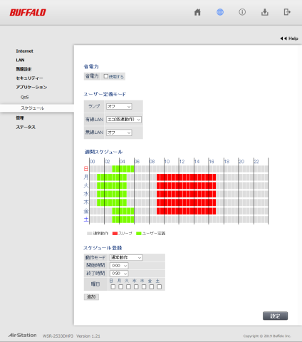 省電力モード。2533DHP3の消費電力は約14Wだが24時間フル稼働で約250~300円/1ヶ月、かかることを考えると意外と馬鹿にならない。ユーザー定義はオンオフのみで有線のみエコも選択可能。上記のように自由に設定可能。詳細設定に入らないといけないが、キッズタイマーと同じように使いやすい。