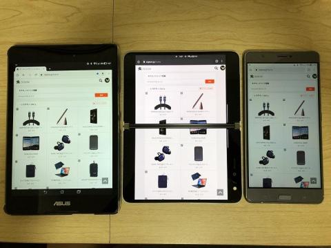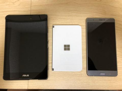 3台を並べると画面を畳んだ状態だと一応シャツの胸ポケットに収まるSurfaceDuoが最小。