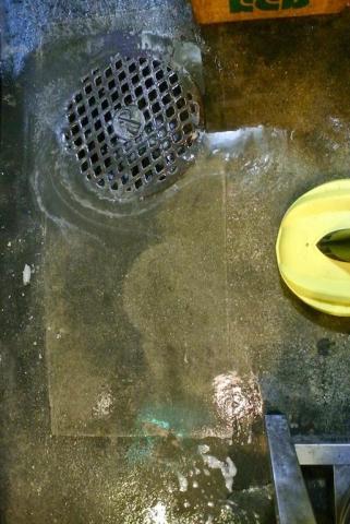 そちらでは、汚れた状態の床のタイル見本が水圧だけでかなりキレイになる様子も収めました
