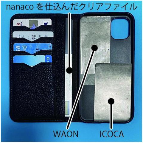 私はこの2枚をジクロルメタン(AMZNリンク)で溶かしてペラペラに…ラッキーなことにWAONは左右5mm程、アンテナが走って無いのでカット可能!するとケースのカメラ部のマドで狭くなったスペースにフィット、結果オーライ…