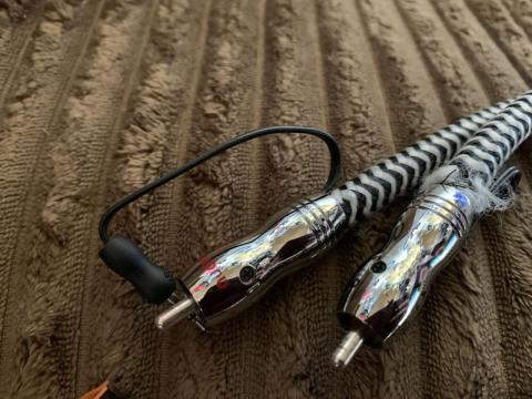 RCAピンプラグは銀メッキであり、かなりきつめの光沢があります。このケーブルは中身の導体もPSS(Perfect Surface Silver)という純銀製のものとなります。絶縁体はテフロン・エアチューブを採用していて、素材固有の音色を排除するよう工夫がなされています。