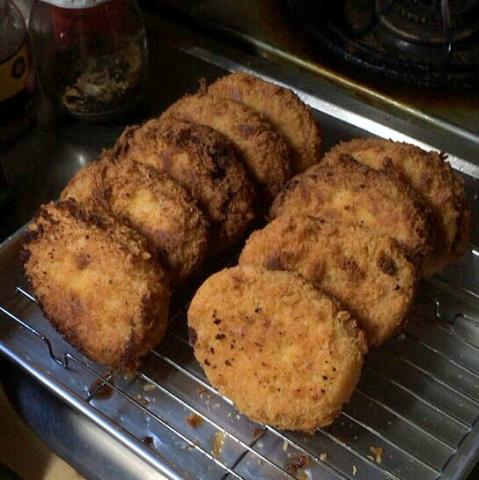 パン粉を作り、芋の団子を平べったく潰してパン粉をまぶし…。