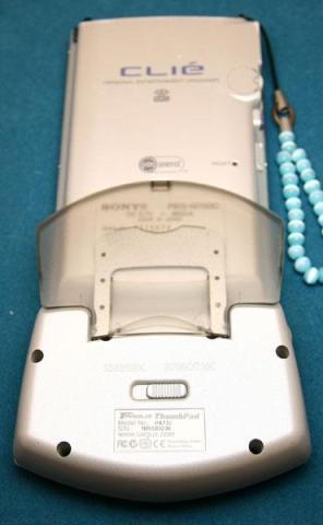 接続はこの手のPalm機周辺機器共通でコネクタ部に差し込み脇のツメを掛けて固定するのですが、本品の場合は特性上PDA本体を持たずに本品側を持つことになるため、補強のためにPDA裏側の穴に引っかかるように固定させて使います。