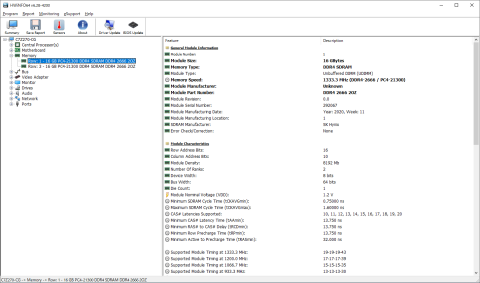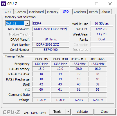 2枚の画像を対比させることで、DDR4-2666 16GB CL=19のJEDEC #10の情報で動作していることが判ります。DRAMチップはSK Hynix製、製造週は2020年11週となります。XMPを利用した場合でもDDR4-2666動作であること自体は変わりませんが、CL=16で動作することも判りますね。