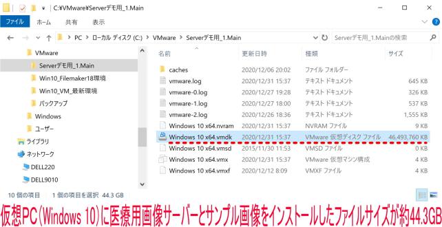 動画にアップすることはできないのですが、『Windows10+医療用画像サーバー+サンプル画像の仮想PC』だと44.3GBもあります。