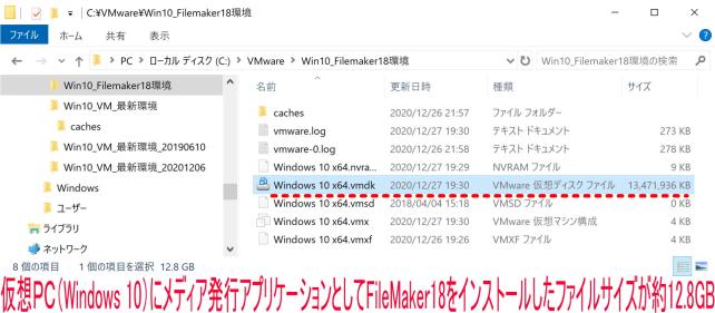 下の画像を見ていただくとファイルサイズがわかりますが、『Windows10+FileMaker18の発行プログラムの仮想PC』が12.8GBのファイルサイズがあります。