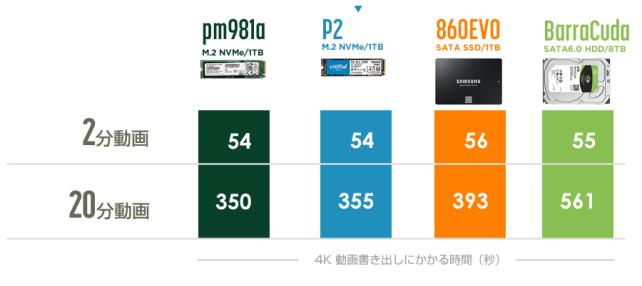 動画の書き出しについては予想通りの結果で、Crucial P2 1TB PCIe M.2 2280SS SSD の得意分野になるのだと思う。表は4K動画を編集し書き出しにかかる時間を測定。