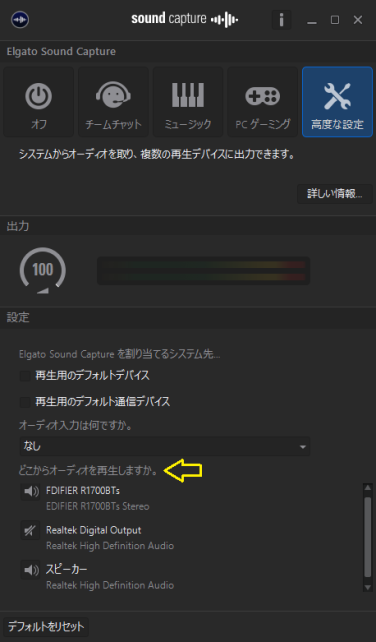 結果的にはElgato sound capture の出力先はアプリの設定で決めているのでここでは何でもよかったです。一番下段のオーディオ再生ソフトがどこに出力させるかの設定さえ間違わなければsound captureの設定通りに出力先を複数持てるという事のようです。