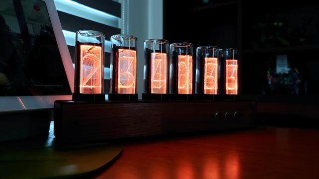 ニキシー管とは、円柱形のガラスケース(アクリルケース)の中にグロー発光減少で数字を表示し刻む、技術的にもビジュアル的にもレトロな時計です。本来のニキシー管は寿命が短くメンテナンスも大変。ですが、この製品はニキシー管ではなくギクシー管。ギクシークロック(Gixie Clock)はにニキシー管の機構を現在の技術で LED に入れ替えて再現したものになります。