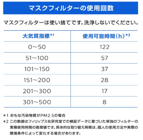 公式より大気質指数によってフィルターの交換目安が変わるようです。