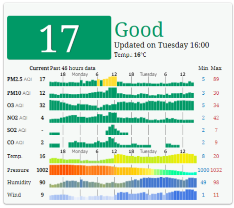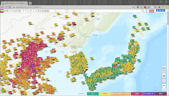 どうやったら指数がわかるのかなと調べたら、「世界の大気汚染」なるサイトがありました。