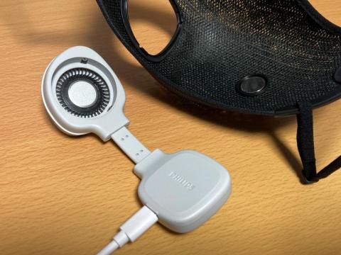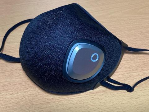ファンが回転して、マスクの下から、マスク内の空気を排出する仕組みになっているようです。
