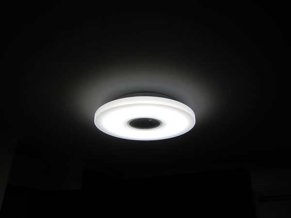 シーリングライトがコンパクトなものなので、微かに本体の赤い LED が光っているのが見えてますね。実際には、全然見えないので気にならないです。目立たないというか見えないのですが、スピーカーの厚さの分、ライトの位置が下に下がるので、若干天井が低くなったような印象を受けます。