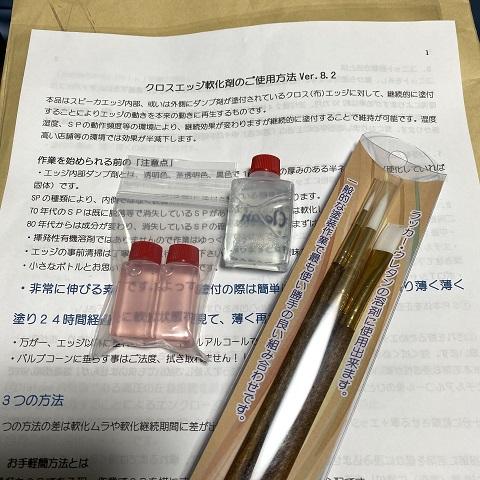 前もってエッジを少しでも柔らかくする方法を調べていました。分解してスピーカーの裏から固まったダンプ剤をシンナーなどで溶かし時間をかけてゴリゴリ取り除く方法が良いそうです。が、私はそんな技量は持ってないので、お手軽な前面より塗って柔らかくするDIATONE専用の軟化剤なる魔法の液体を購入。硬いエッジのみに塗る為、そこで筆も購入しておいた。準備は万端。