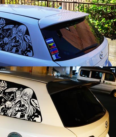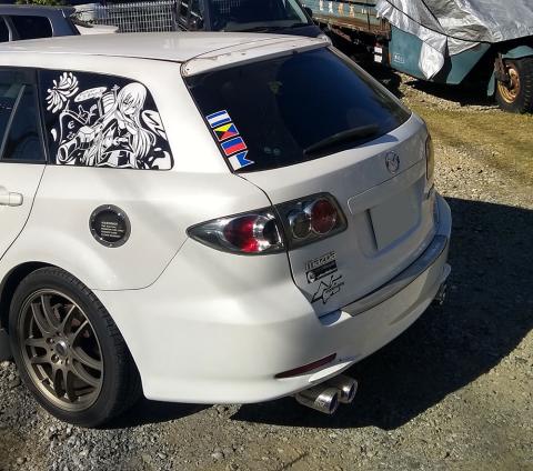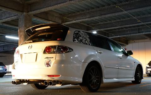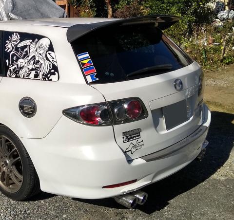 初代アテンザスポーツワゴン用の社外スポイラー(写真黒い方)。