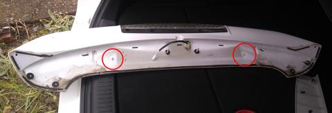 それに加えてハイマウントストップランプの配線が繋がっているコネクタ(左側の緑丸)とそれが通る樹脂パーツ(写真右側の緑丸だが写真では見えない)を外しておけば良い。
