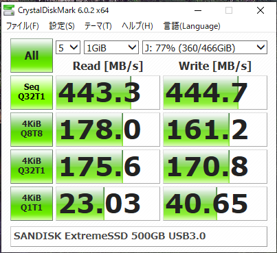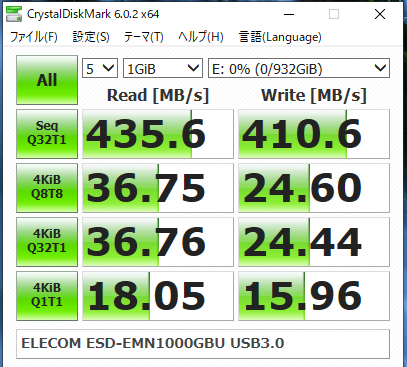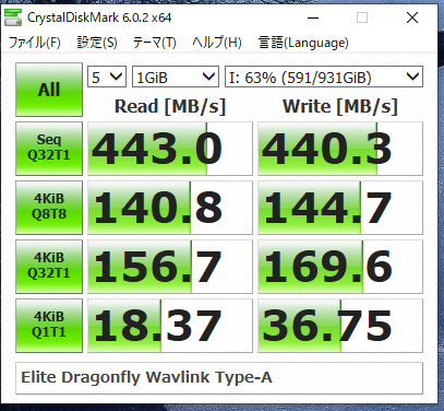 CristalDiskMarkでは以下の結果でシーケンシャルはカタログスペック以上したが、