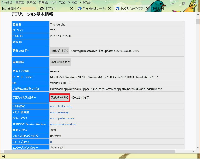 すでに使用中のThunderbirdインストール版の「ヘルプ」-「トラブルシューティング」を開きます。