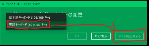 - 英語キーボードを選んで、「今すぐ再起動」をクリック