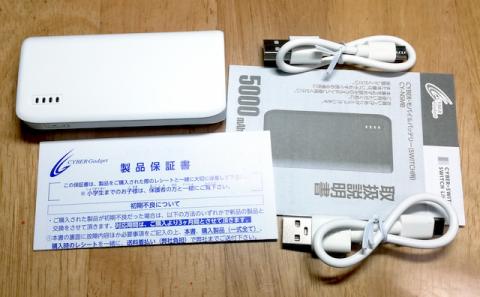 内容物。モバイルバッテリー本体に、USBケーブルが2本、取扱説明書と製品保証書。