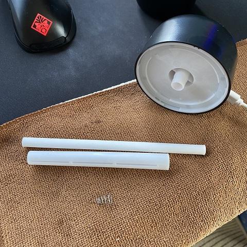 外カバーの先端にバネが先に入っており、このバネが給水芯を上に押し上げて噴霧器へ密着させる、言わばそこがキモだろー!な模様。要はバネの伸びがなく給水芯が噴霧器と密着していなかったみたい。写真は既にンガーっと伸ばした状態。