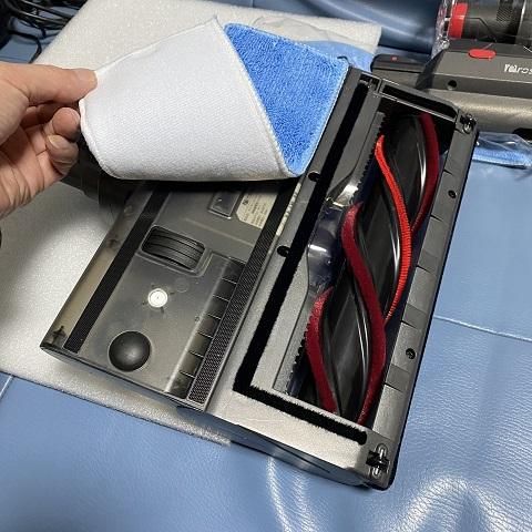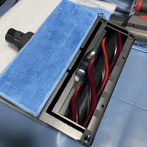 白く丸い部分から水がマットに染み出して拭き上げする仕組み。先にゴミを吸引し拭き掃除をしてしまうのです。