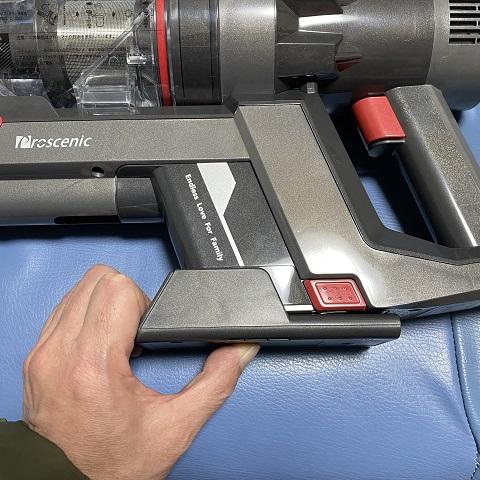 ゴミを取り出す際は、スイッチでなく側面の爪を外す構造。