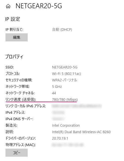次に、VAIO S11(802.11ac)を接続して、プロフィールを確認すると、上り/下り共に780Mbpsで繋がっていました。