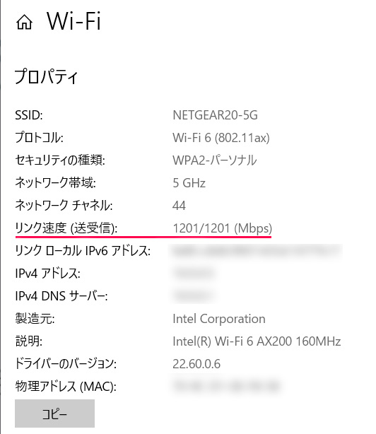 先ず、我が家で「唯一のWi-Fi 6対応の、デスクトップPCのマザーボード ASUSTek製ROG STRIX Z590-A GAMING WIFI(802.11ax)を無線で接続し、プロパティを見てみました。