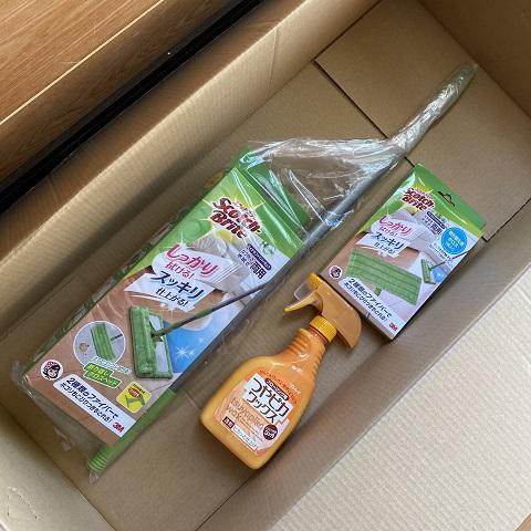 クロス付きのモップ1式。あとヘラみたいなものはクロスのゴミかきみたいです。気っと使わないと思う。それと予備のクロスを1個準備しました。予備クロスだけ買おうにも、あわせ買い商品だったのでどうせなら買っておこうと思いました。