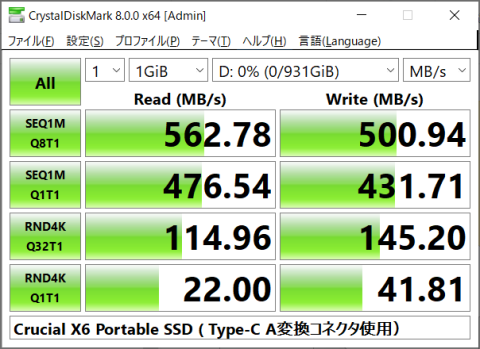 なお、Type-C A変換コネクタを用いてたベンチマークも計測しましたが若干スピードが低下してました。