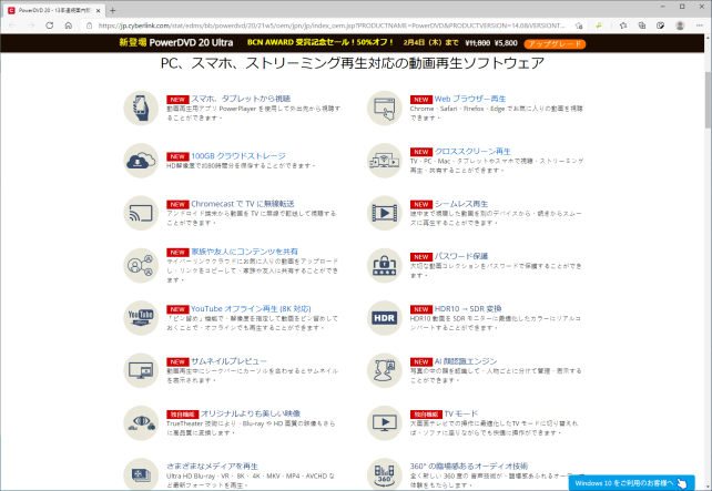 そしてPowerDVD 14 Ultraを起動すると、頻繁に表示されるのがCyberLinkによるアップグレードセールの案内です。現状ではPowerDVD 20 Ultraが5,800円という訳で、普通に買うよりはそれなりに安くなっていることから、何となく釈然とはしないもののこれを購入することにしました。