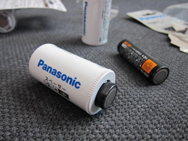 ウチの場合はほとんどの乾電池を充電池に転換済みなのですが、この製品に使う単2電池も写真のようにスペーサーを付けることで単2型になるようにして使っています。