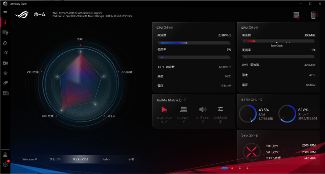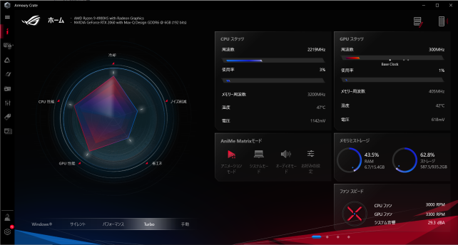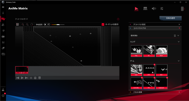 Anime Matrix 今回購入したPCはこのAnime Matrix機能付きなので、設定もこのツールから変更できます・・・(正直なところ最初遊んだだけで後は切ってますw まぁネタツールですねw)