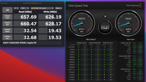 動画編集ソフトはキャッシュやバックアップ用のドライブは高速の方がパフォーマンスがあがりますので、MAC環境ではThinderbolt3の40Gbpsに続くUSB3.2gen1(10Gbps)でこのくらいのRead/Write速度が出れば問題ありませんね。