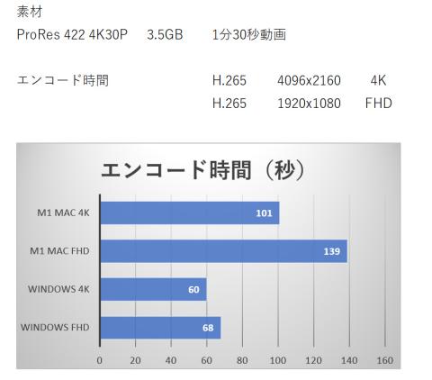 本レビューとは関係ありませんがWindows(i9-10900K+GTX1070)vs M1 Mac Miniでのエンコード比較表を以下に図示します。