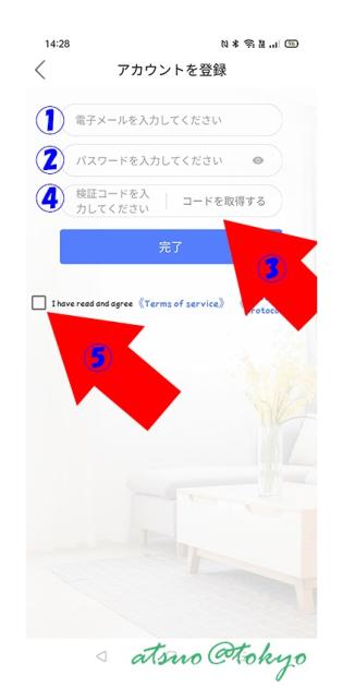 記入した電子メールアドレス宛に検証コードが届くので、④に検証コードを入力し⑤にチェックを入れ、[完了]をタップします。