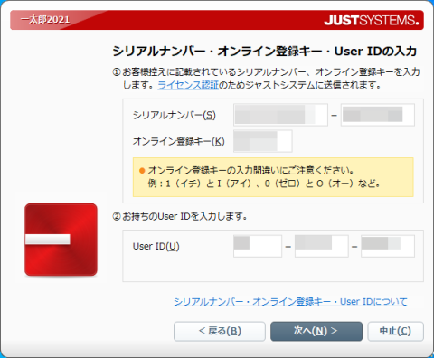ジャストシステムの直販である「Just MyShop」で購入した場合には、購入時点でユーザー登録の準備は既に出来ており、ここで全ての項目を入力しておくとアクティベーションとユーザー登録が同時に完了します。